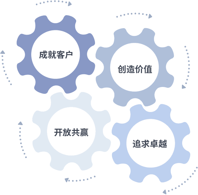 成就客户是一切决策的出发点,,,,创造价值是衡量所有工作的标准,,,追求卓越是我们做事做人的态度,,,,开放共赢是我们的格局也是最终的结果。。。价值观的齿轮环环相扣,,,推动着组织里的每个人不断向前。。。